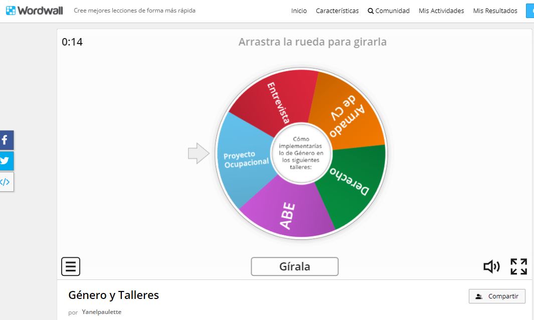 Una de las actividades que hicimos fue la rueda de la fortuna. ¿El objetivo? Pensar ejemplos de aplicación práctica de la teoría en cada cada uno de los talleres que forma parte del curso, ya que consideramos que el abordaje de los talleres que brindemos desde el voluntariado tiene que tener una perspectiva de género.